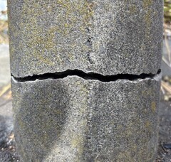 Reinforced concrete lamp posts are usually greater than 30 years old. They are either hollow (and prone to filling with water) or solid concrete with a small cavity for the electrical fudse. We observe corrosion of steel reinforcement, cracking of the concrete and vehicle impact damage. Internal access plates for electrical work are usually poorly fitting due to age.